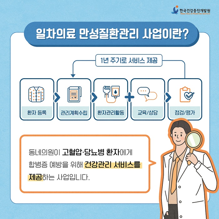만성질환자 대상 건강상담 및 방문관리 서비스는 병원 밖 관리에 초점을 둬요.